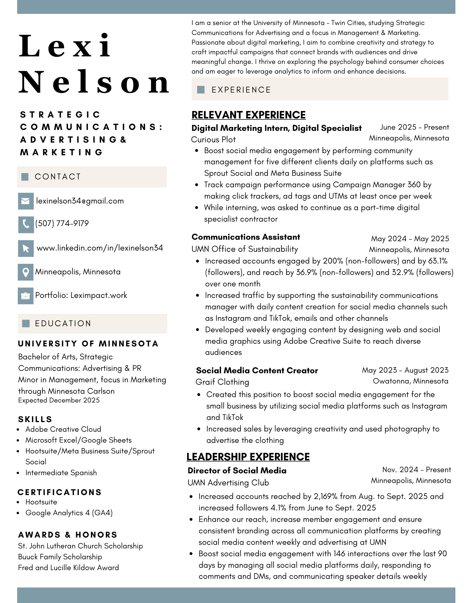 A senior at the University of Minnesota–Twin Cities, studying Strategic Communication: Advertising & PR with a focus in Management & Marketing. Passionate about digital marketing, I aim to combine creativity and strategy to craft impactful campaigns that connect brands with audiences and drive meaningful change. I thrive on exploring the psychology behind consumer choices and am eager to leverage analytics to inform and enhance decisions.